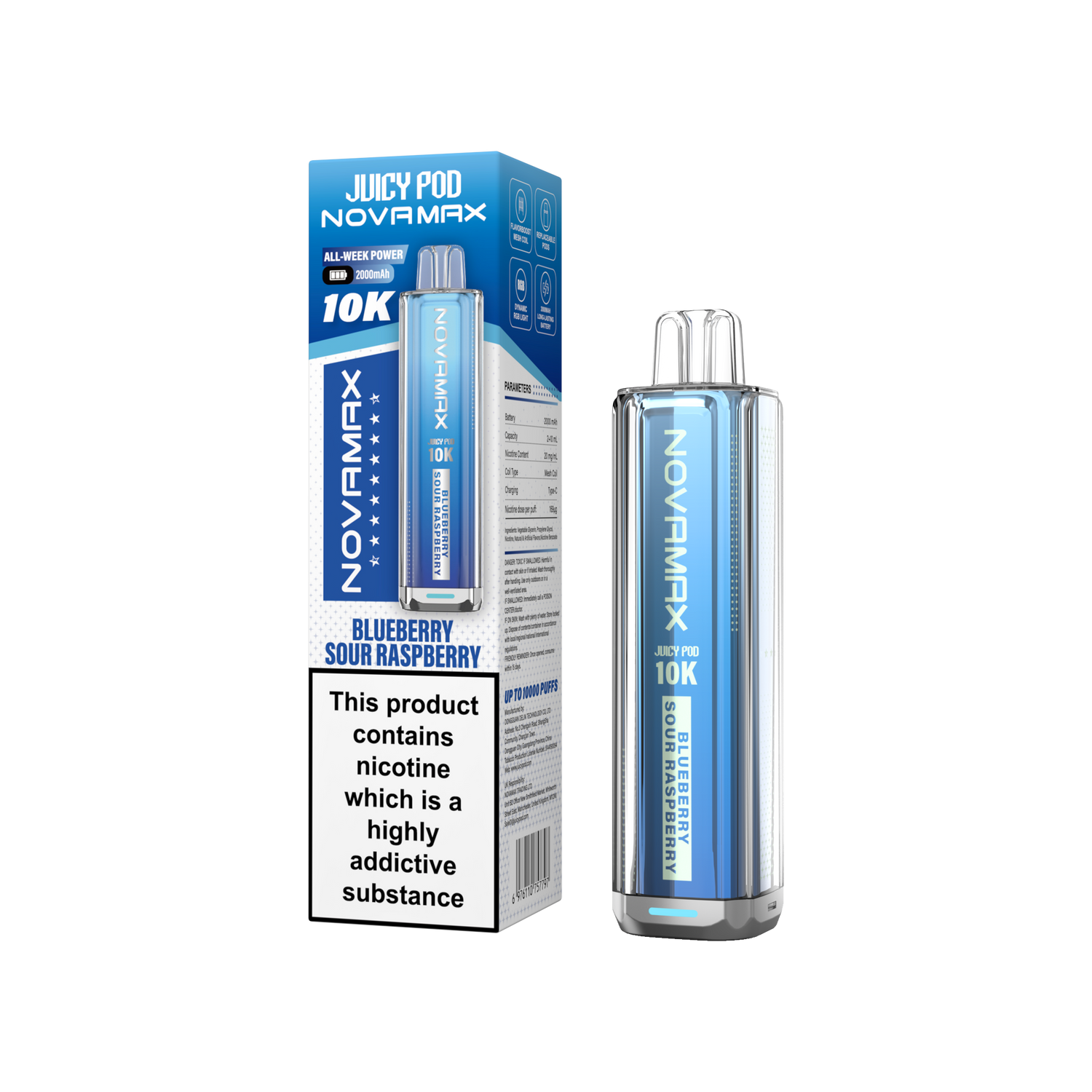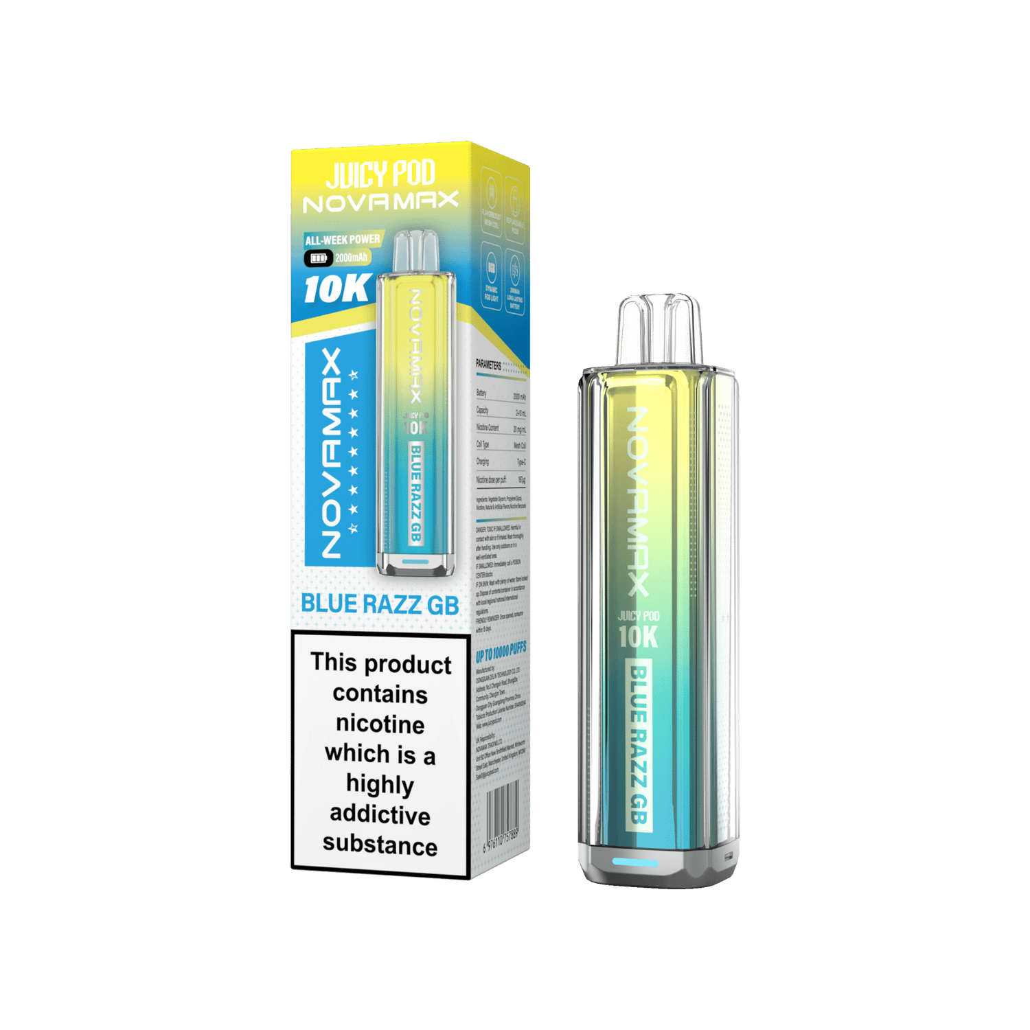Juicy Pod Novamax 10k Prefilled Pod Vape Kit - Pack of 5 - Blue Razz GB is backordered and will ship as soon as it is back in stock.
